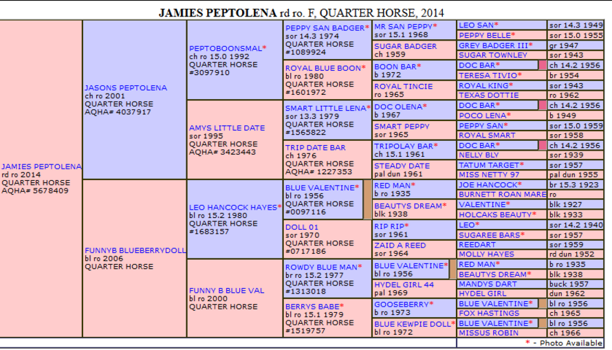 Jamie is by Jasons Peptolena (by Peptoboonsmal) out of Funny B BlueberryDoll (by Leo Hancock Hayes). As the granddaughter of the legendary Peptoboonsmal and great-granddaughter of Smart Little Lena, Jamie has Blue Valentine lines on the bottom of her pedigree, bringing performance lines to her foals.