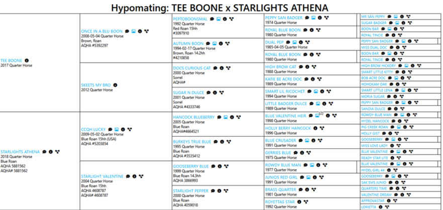 Hypomating charts may be found at All Breed Pedigree, where the symbols following each horse’s name are interactive and, to the extent available, provide general information, AQHA information, a photograph, and genetic information.