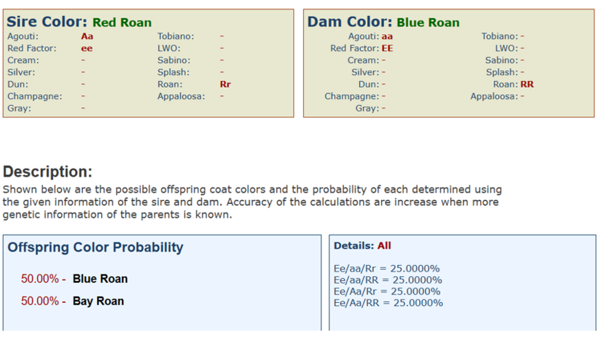 Color probabilities have been calculated using both the Animal Genetics Coat Color Calculator and the Animal Genetics Horse Coat Color Calculator.
